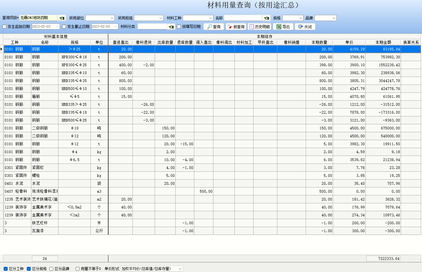 【材料用量查詢(按用途】是按用途分類查詢工地材料用量。查詢前需要先選擇項目。該功能界面中的可查詢條件與前面的【材料用量查詢】類似。用戶也可通過設置【材料工種】、【名稱】、【發生日期】等條件進行查詢。