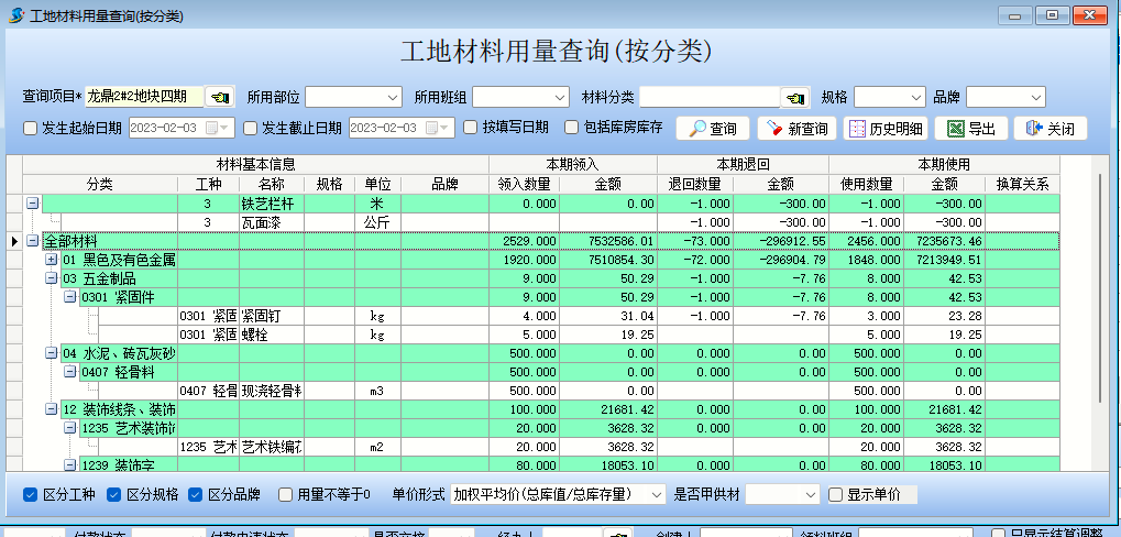 【材料用量查詢(按分類)】是按材料分類分類查詢工地材料用量,在查詢前需要設置查詢項目。