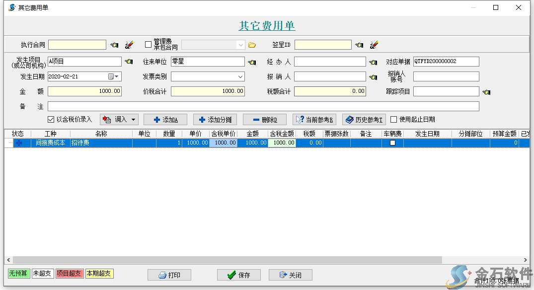 用戶可通過其它費用單錄入費用,費用會歸納至對應的發生項目。