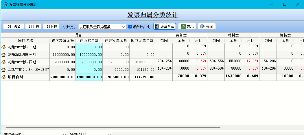 【發票歸屬分類統計】可以統計出各類進項發票占工程總價或開出發票的比例,該功能可以讓我們判定出每類進項票與項目預算對應成本占比一致,從而實現進項發票在“稅務外賬”上的真實性。(例如:通過預算得出材料大約占到工程總價的55%,那么我們要在工程快竣工時確保材料的進項發票要占總進項票的55%左右)。