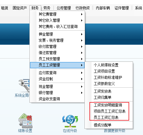 | 工資統計 | 提成分配 | 應付賬款統計 | 資金統計 | 間接費統計 | 發票統計 | 項目稅金核算 |