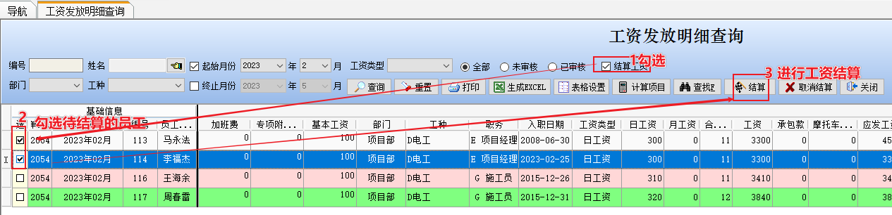 此外,在點擊結算工資多選框后,可以在此界面對員工進行工資結算或取消結算,如下圖所示: