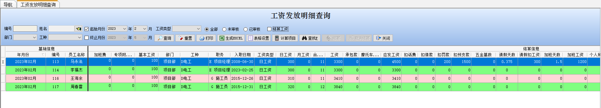 (1)工資發放明細查詢。可以根據姓名、部門、工種、起始月份、終止月份等查詢,如下圖所示: