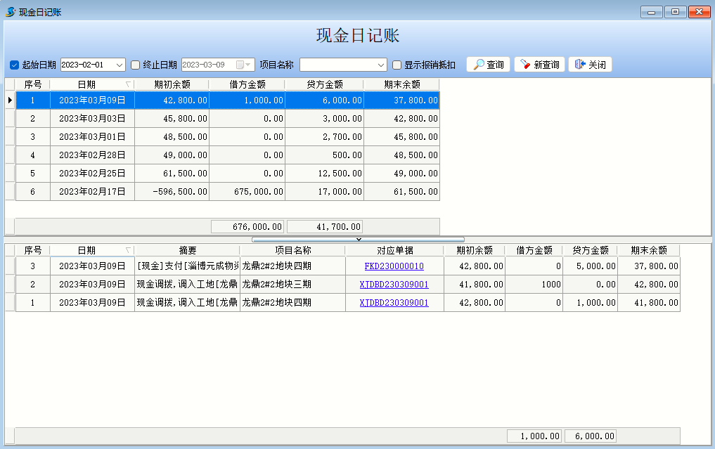 系統中創建完成的收款單和付款單、員工工資單、員工借款單、還款單等單據支付方式選擇現金的都可以自動生成現金日記賬?,F金日記賬可以篩選時間和項目,統計每一天以及每一天中每一筆期初余額、借方金額、貸方金額、期末余額。
