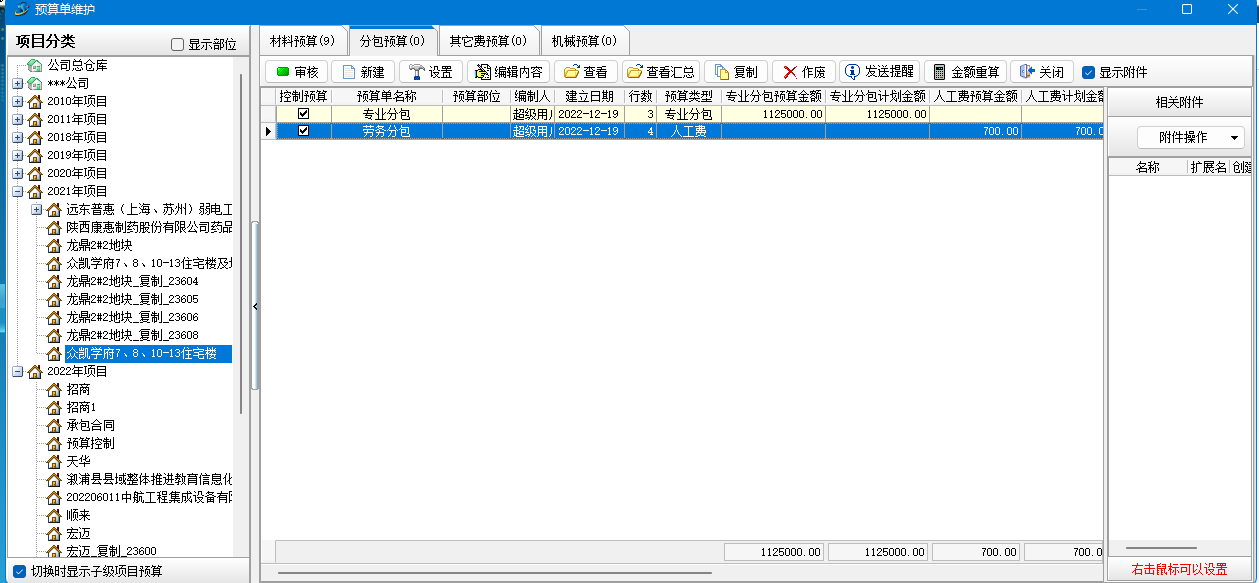 分包預算單是錄入分包預算信息,可以分為勞務分包預算和專業分包預算,設置控制預算后,對分包管理數量起控制作用。
