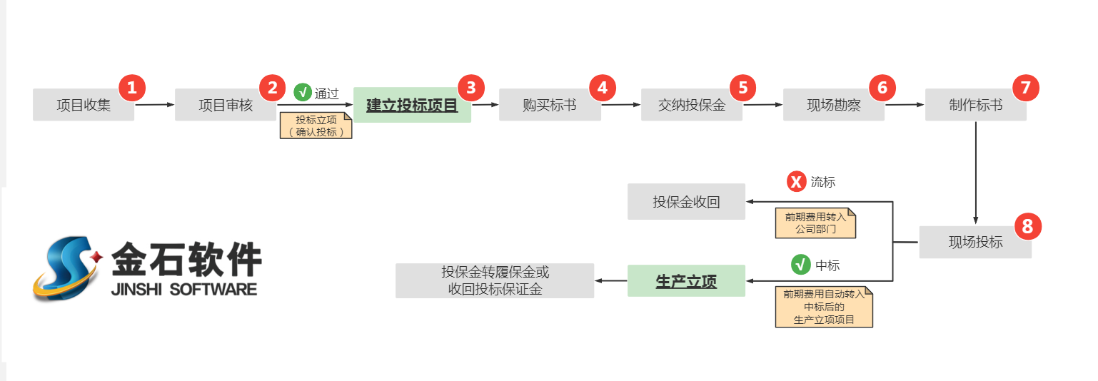 4.項目管理:該模塊從項目信息收集出發,重點控制各環節的審核,注意投標各環節的細節管理,如保證金控制、回收、現場調查等。