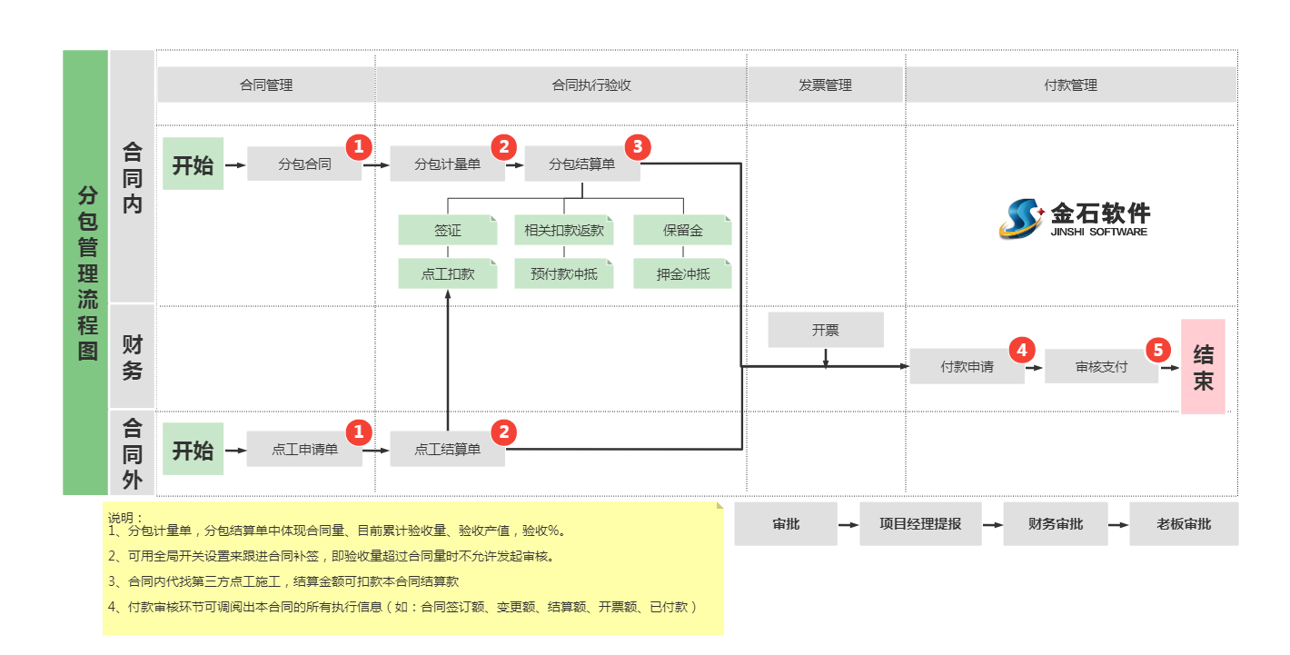 | 分包合同 | 合同擬定、審批、合同簽訂、原件存檔、預付款、合同驗收、代扣款、代扣材料、扣款返還、付款、結算、質保金、履約保證金、合同統計 | |