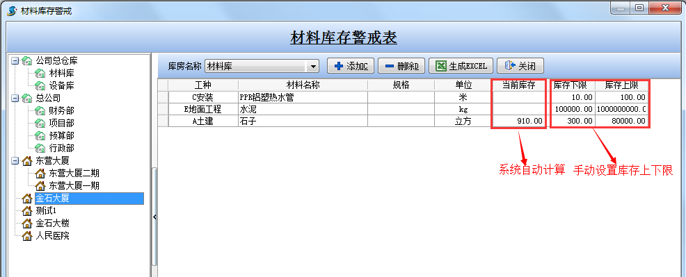 為了防止因采購不及時,用量突增等導致出現材料庫存不足,影響項目進展情況,軟件提供材料庫存警戒提醒功能。可以在系統內設置庫存上限和下限,當系統檢測到庫存發生變化后,相應的上限下限降低,將會對對應倉儲的責任人員發起提醒。
