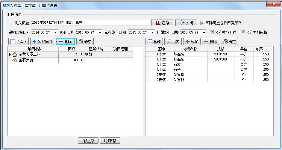 軟件提供多項目的采購庫存及用量匯總表,并可以同材料進行用量對比。用戶可以在對應的材料匯總查詢模塊根據時間、項目等選項進行細致查詢。
