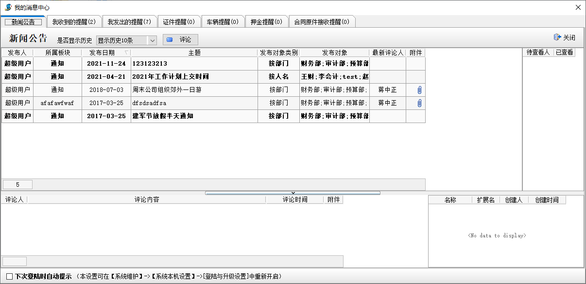 消息中心匯總顯示當前用戶收到的各類消息,如新聞公告、我收到的提醒、我發出的提醒、證件提醒、車輛提醒、押金提醒和合同原件接收提醒等。
