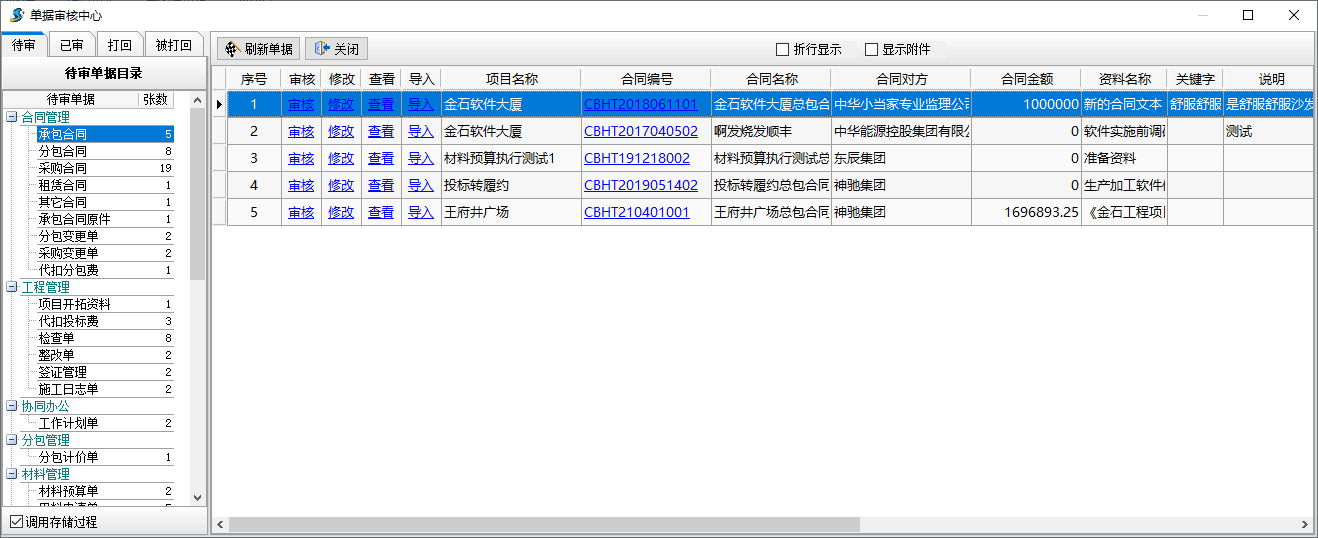 1、審核中心審核中心匯總顯示當前用戶所有待審核單據或合同。當用戶登錄軟件時,會彈出單據審核中,用戶可以在此對所有待審核的單據進行修改或審核處理,如下圖所示: