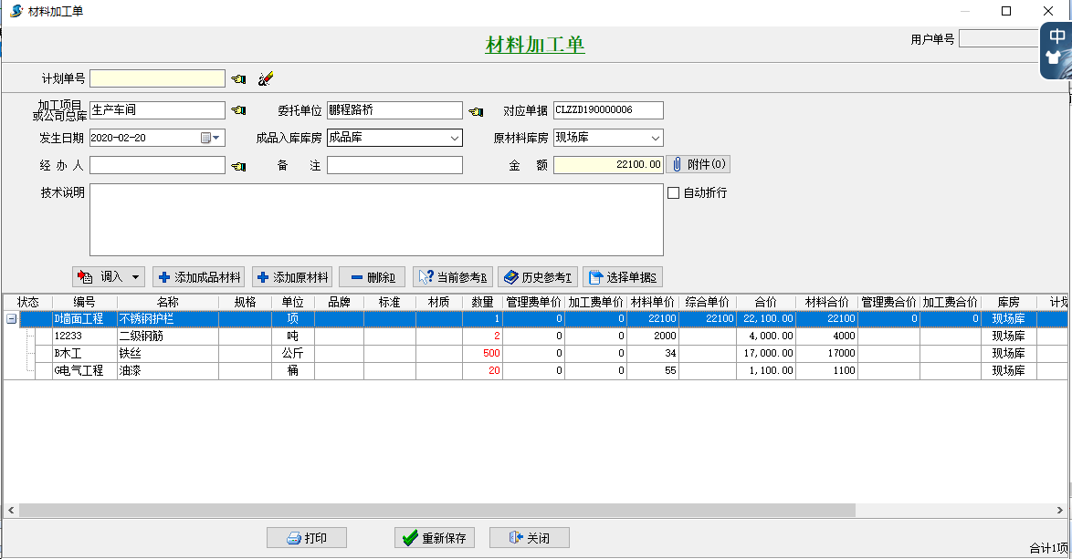 車間生產完成后,需填報材料生產單,其中委托單位為生產車間的隸屬公司,成品庫房和材料庫房分別填報對應項即可。