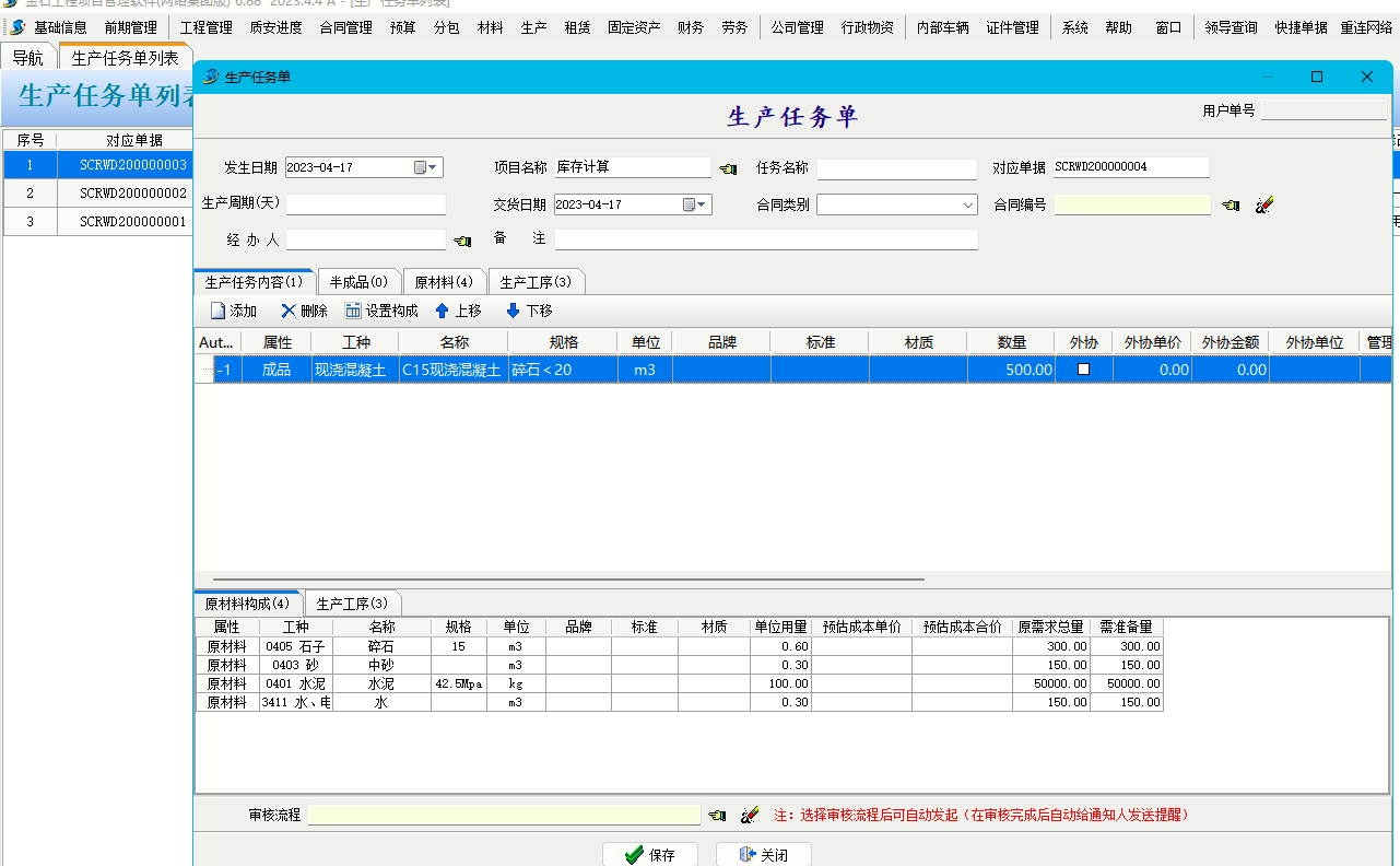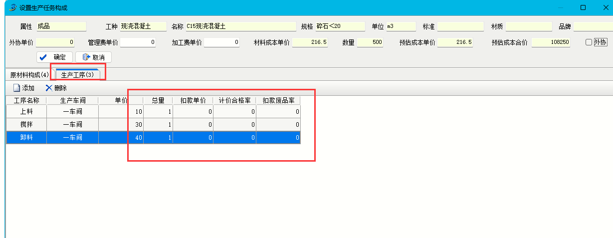 選擇需生產的材料后可以點擊設置構成,設置配比及工序信息。在原材料構成這里可以設置預估成本單價和查看原材料需求總量。