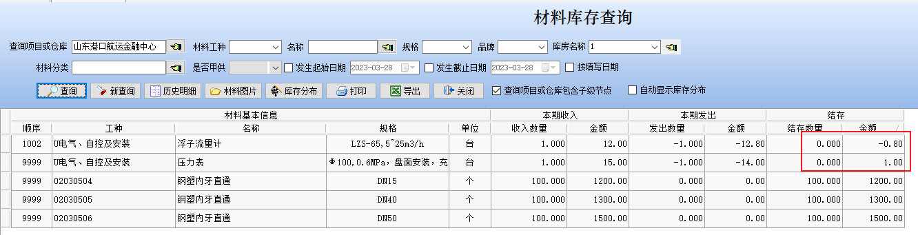 材料管理中新增【庫存平賬單】。【庫存平賬單】用來對庫存中結余數量為0但結存金額不為0的數據做平賬處理,即把金額歸零。如下圖所示,結存金額為非零數據,