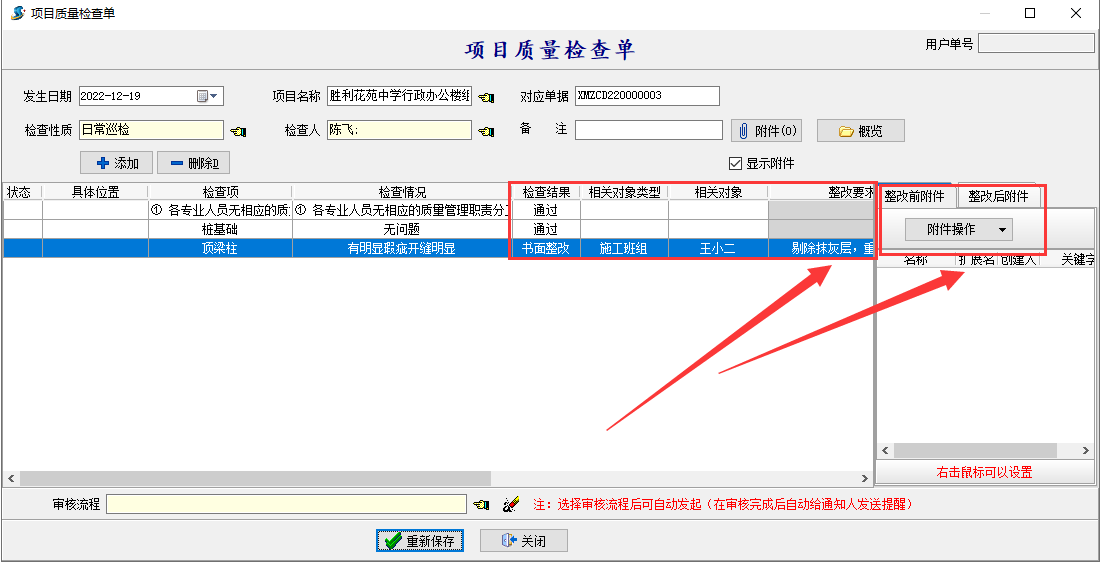 單據用法:主要填寫項檢查結果、整改要求、整改要求、整改狀態等并上傳整改前附件和整改后附件(如下圖)