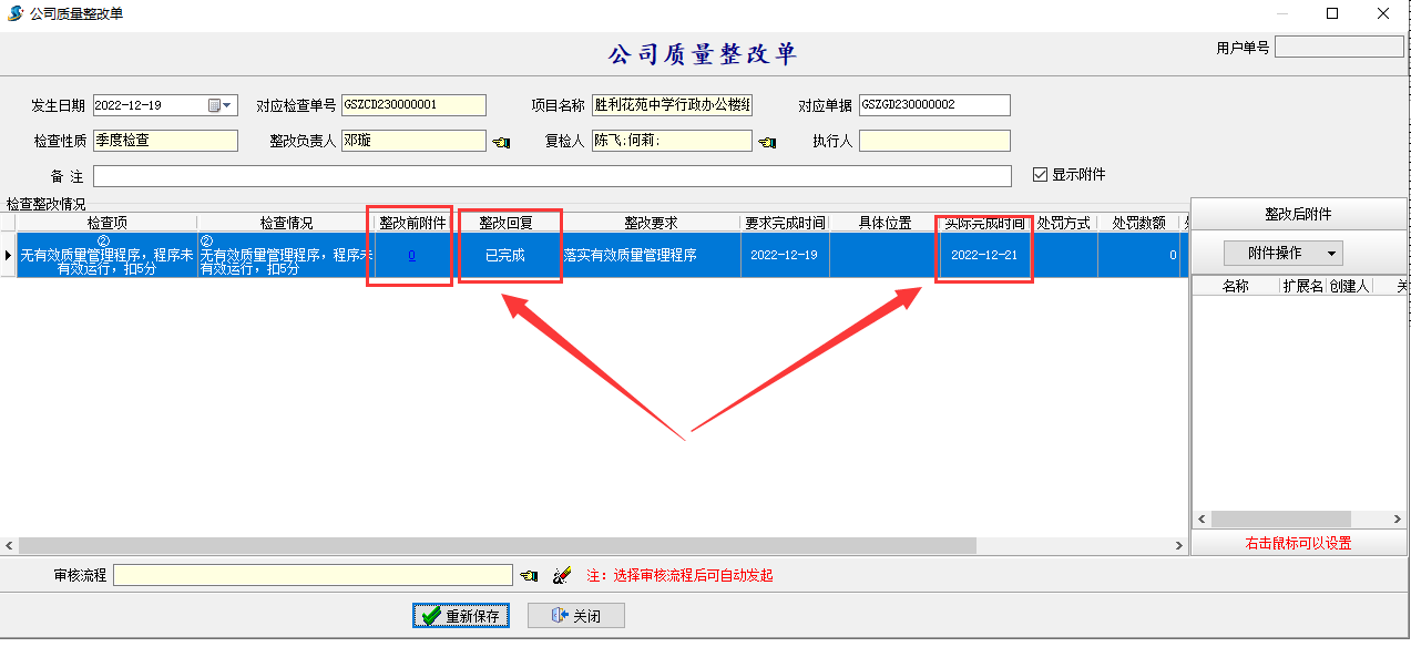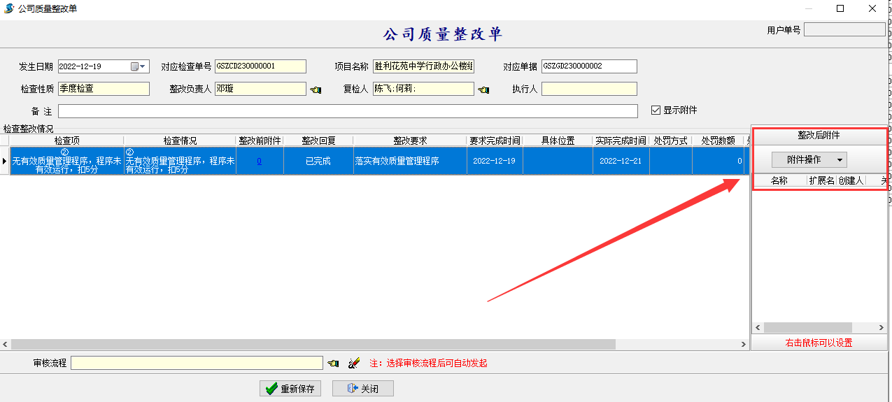 ③單據選擇審核流程保存后還會彈出整改后附件為項目整改完成后現場照片(如下圖)