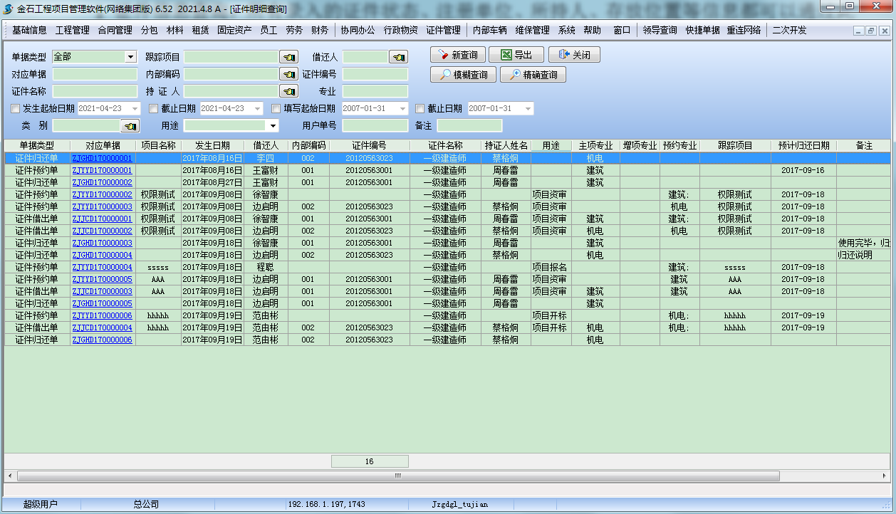 通過金石軟件證件管理模塊可實現科學化、信息化管理,有效控制建筑企業普遍存在的證件問題。